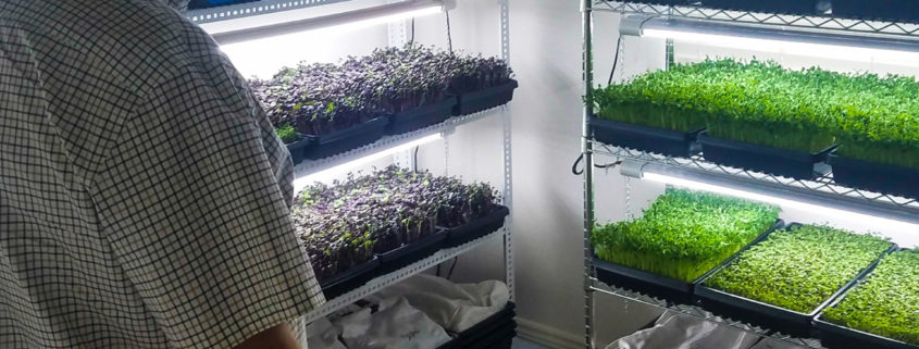 At this point in the conversation, I revealed how little I knew about micro-greens by asking Darren what the difference was between sprouts and micro-greens. He patiently explained to me that sprouting is done in a cool dark place and is basically the root of the plant. Micro-greens are grown in a soil substrate and is the actual seedling. This distinction is why micro-greens are so healthy for you, they contain all the nutrients from the seed. Darren went on to tell me that he had been eating a micro-green salad every day for a month and the difference in his energy levels and overall health has been dramatic. “The micro-green can be up to 40 times more nutrients than the grown version of the plant.” Darren again started explaining the basic growing process. He then quickly popped out of his seat saying it would be easier to just show me, and I followed him to the grow room. As soon as I stepped over the threshold into the room, I was hit with the overwhelming scent of fresh air as two walls full of green beauties grew silently before me. “WOW! This is awesome.” Katie peeked her head in smiling. “Do you love this?” I asked her, pointing to the plants. She smiled, “Yes I do. I’ll often come stand in here and ask him questions about stuff because I’m just in awe of what he’s doing.” I nodded in agreement. Awe is exactly what I felt.
